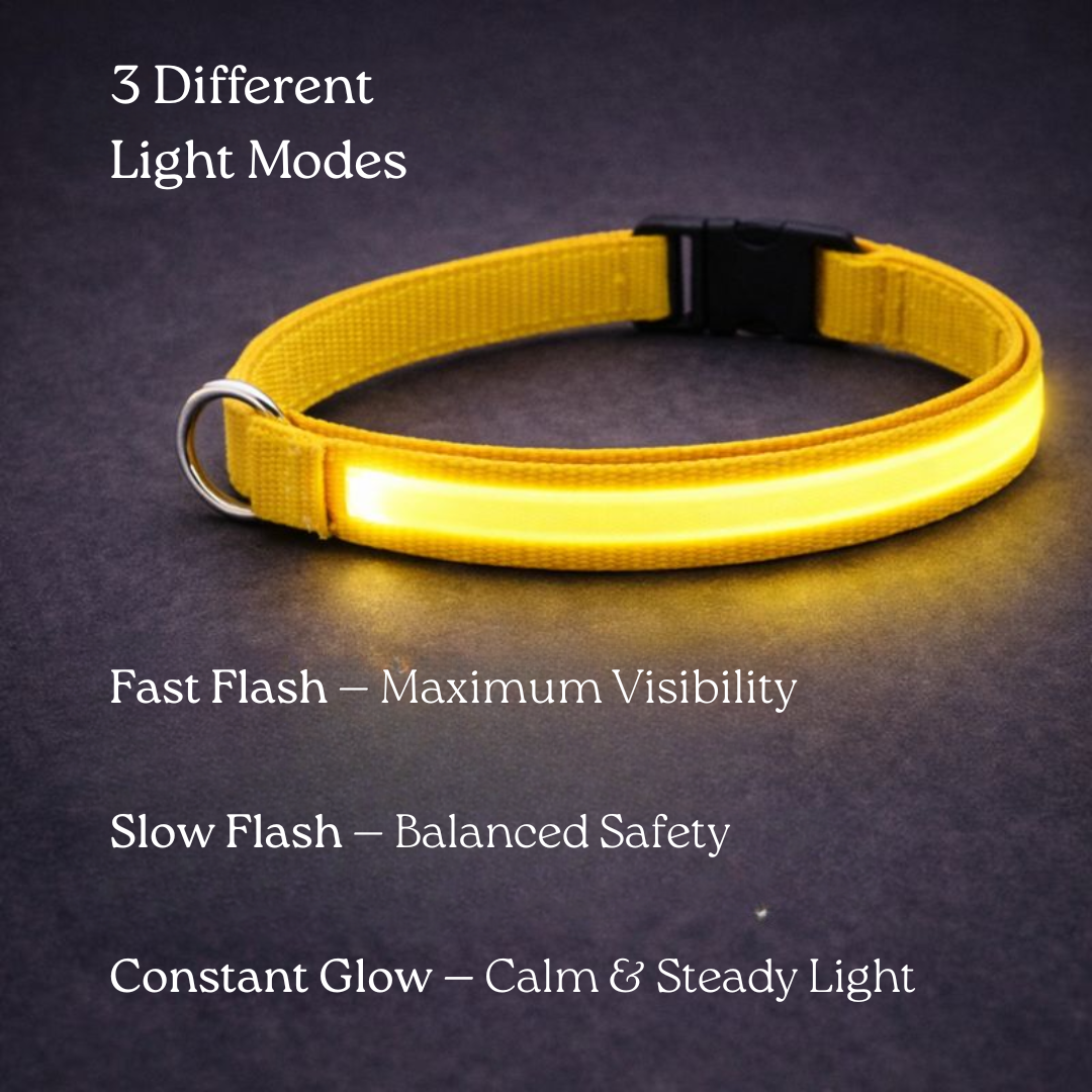 A: The collar features three light modes that can be cycled using the power button: fast flash for maximum visibility, slow flash for balanced safety, and a constant glow for calm, continuous light. This allows you to choose the best option depending on your surroundings and lighting conditions.